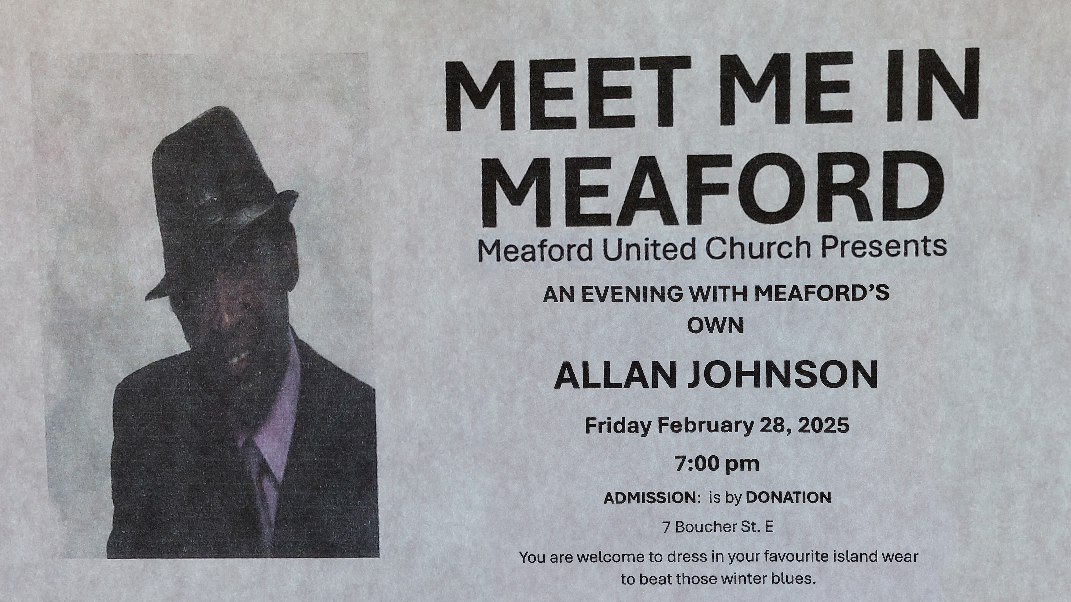 Come join us for an Evening With ALLAN JOHNSON. Allan has lived in Meaford over 30 years and is best known for writing the famous song MEET ME IN MEAFORD. Allan is a singer/songwriter who originally hails from Nassau Bahamas. Allan sings popular cover songs as well as his own original island tunes. Allan’s fundraising concert for Meaford United Church, 7 Boucher St. E, will take place February 28 at 7:00 PM , and we hope you join us. Feel free to wear your favourite Island wear, to help beat those winter blues. Admission is by donation.